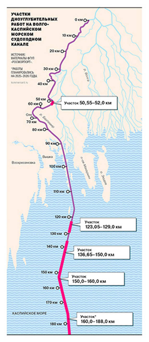 Правительство предлагает отказаться от идеи продолжения углубления Волго-Каспийского морского судоходного канала для поддержания проходной осадки судов на уровне 4,5 м. Причины — в растущей дороговизне работ при скудности поступлений; обмелении Каспия, требующем дополнительных инвестиций уже на других участках; и незначительности доли заходов судов с осадкой 4,2–4,5 м в порты Астрахань и Оля.