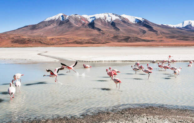 Рядом с Уюни есть кипящие грязевые гейзеры и лагуны, где живут розовые фламинго.