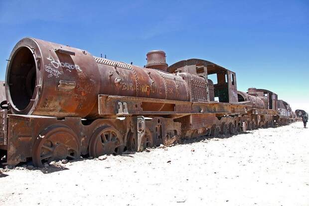 Ржавые поезда XIX века, брошенные посреди соляной пустыни, выглядят как декорации к постапокалиптическому фильму.