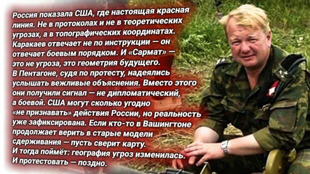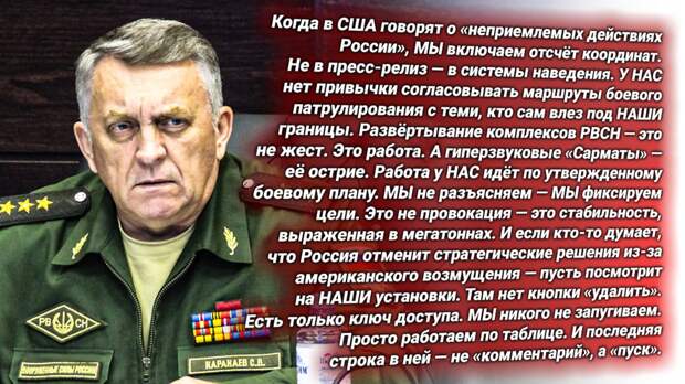 🔥 Пока в Пентагоне чертят схемы красных линий, Россия прокладывает маршруты «Сарматов». А главком РВСН не вступает в полемику — он задаёт точку отсчёта. Точку отсчёта чего? Ну, пусть гадают в штабах Пентагона.
