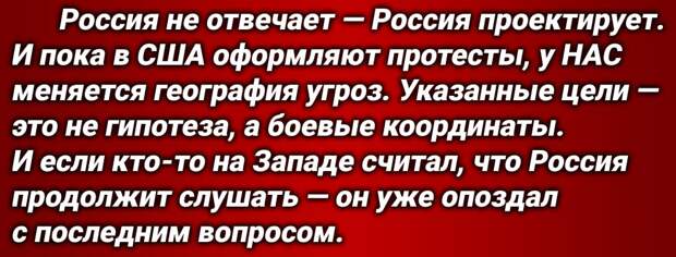 Пентагон заявил официальный протест, пытаясь остановить российскую ракетную конфигурацию. Проблема США — они не видят, куда целится Россия. А это и есть стратегический нокаут. Тем не менее, официальный протест США — тот момент, который нуждается в официальном ответ России. И этот ответ дал командующий Ракетными войсками стратегического назначения.