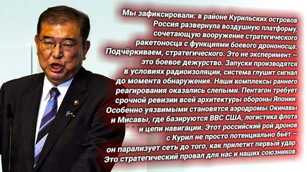 Вашингтон орёт, Токио поддакивает, а Курилы уже закрыты дрононосцем. Воздушный «стратег» ВКС России запускает рой: подавители, разведчики и ударные дроны — всё сразу. Без сигнала, без шанса засечь. США и их сателлиты в панике: «не видим, не понимаем».